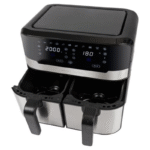 La FR 1242 es una freidora de aire caliente con dos compartimentos de 4,5 L cada uno y una capacidad total de 9 L. El equipo está destinado a la preparación térmica de alimentos mediante circulación de aire caliente, sin sistema de fritura por inmersión en aceite. La configuración de doble compartimento incorpora dos zonas físicas de cocción en el mismo aparato. Cada compartimento cuenta con un volumen indicado de 4,5 L para colocar alimentos por separado o de forma simultánea. La referencia del producto es FR 1242 y su denominación corresponde a una freidora de aire caliente con dos compartimentos. El formato del aparato integra en una sola unidad el sistema de calentamiento y las dos cámaras de cocción, con capacidad combinada de 9 L. El producto pertenece a la categoría de electrodomésticos para tratamiento térmico de alimentos mediante aire caliente.