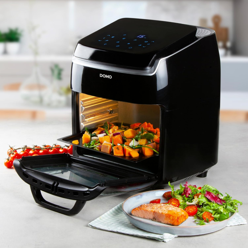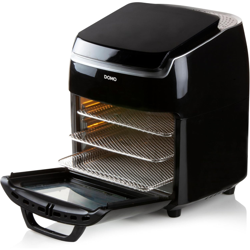 Freidora de aire Domo DO534FR con capacidad de 10 litros y sistema de circulación de aire caliente. El panel de control digital integra 8 programas automáticos, selección manual de temperatura entre 65 y 200 °C y temporizador. La estructura tipo horno incorpora puerta frontal con ventana para supervisión visual del contenido durante el funcionamiento. El conjunto incluye rejillas para cocción, bandeja de goteo, cesta giratoria, pincho giratorio para asador y herramienta de extracción. Según el programa y el accesorio utilizado, el aparato admite funciones de freír por aire, hornear, asar y deshidratar. Marca: Domo. Modelo: DO534FR. Capacidad nominal: 10 l.
